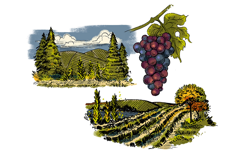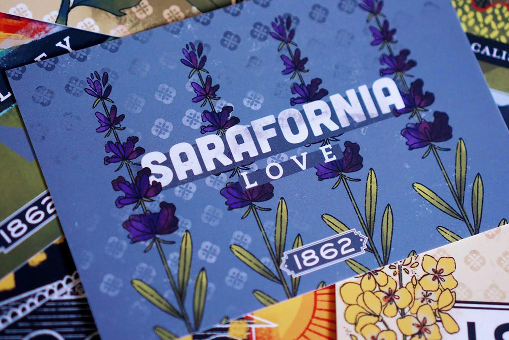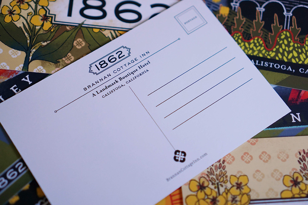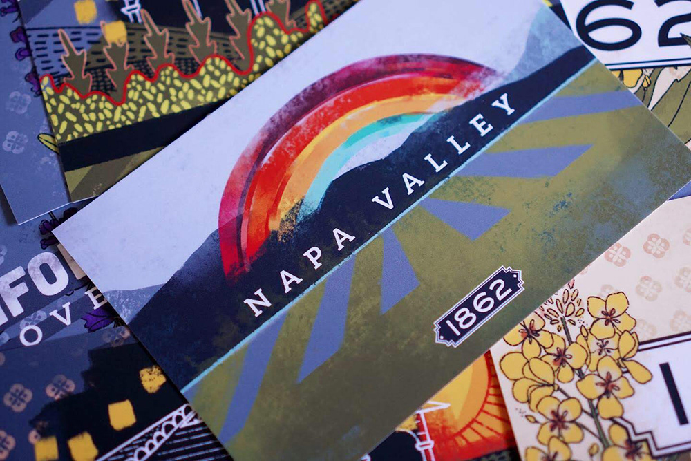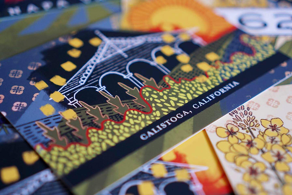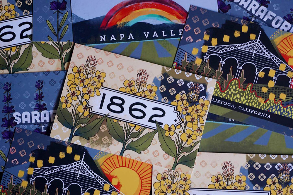 Souvenir postcards and spot illustrations depicting florals and landscapes expressive of Napa Valley and it’s warm wine country atmosphere.