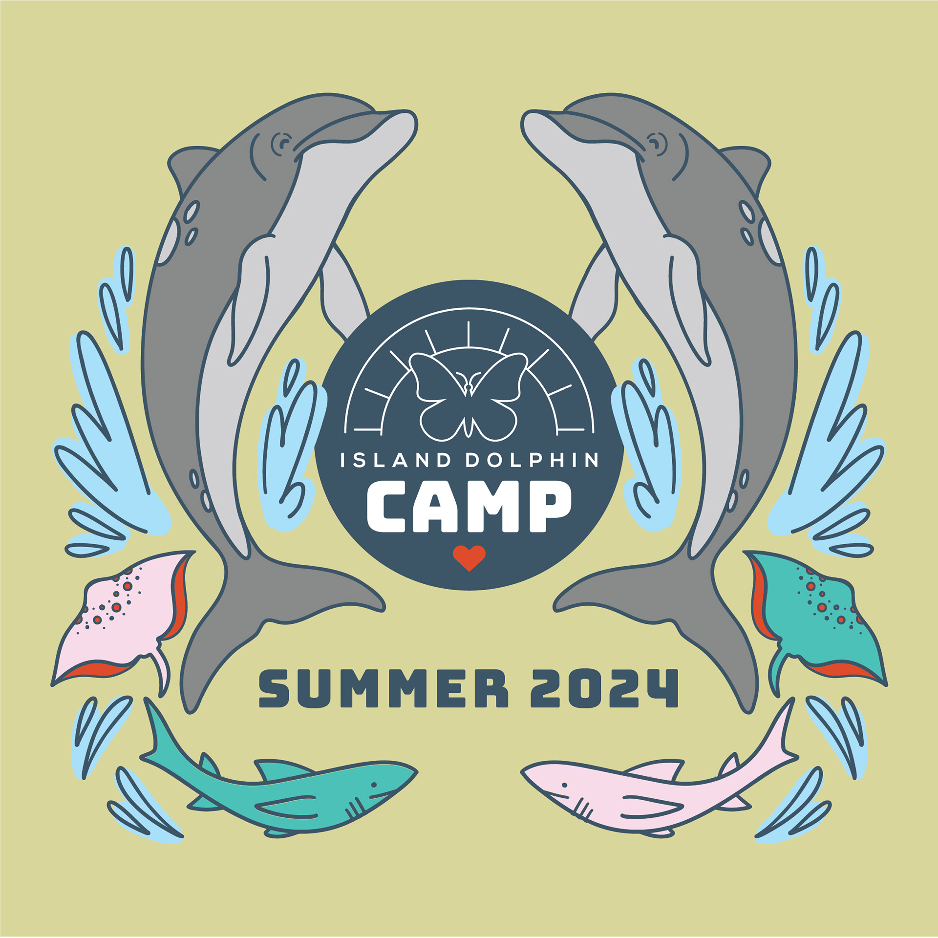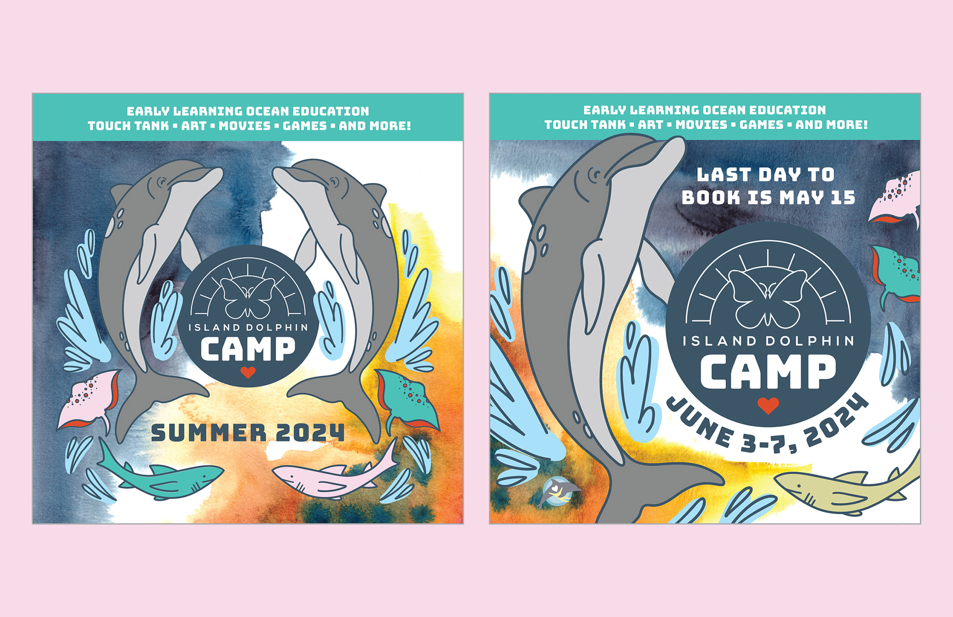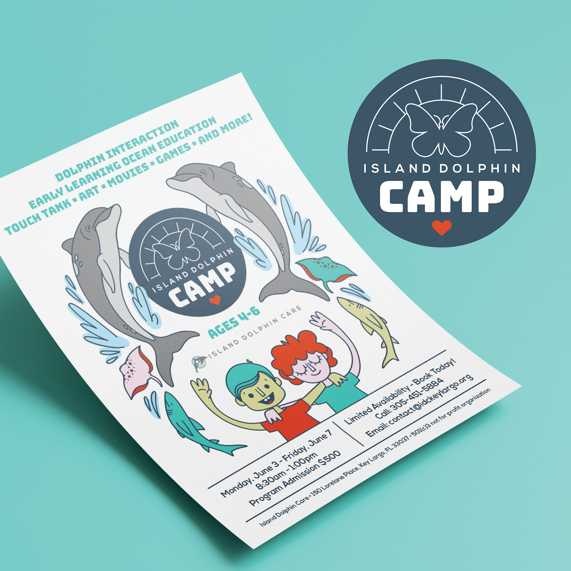 Illustration, branding, and design of posters, flyers, and social media assets for Island Dolphin Camp: A Summer Camp for Kids Ages 4-6 hosted by the not-for-profit organization Island Dolphin Care. This educational program in Key Largo, Florida encourages respect for marine animals and the environment.