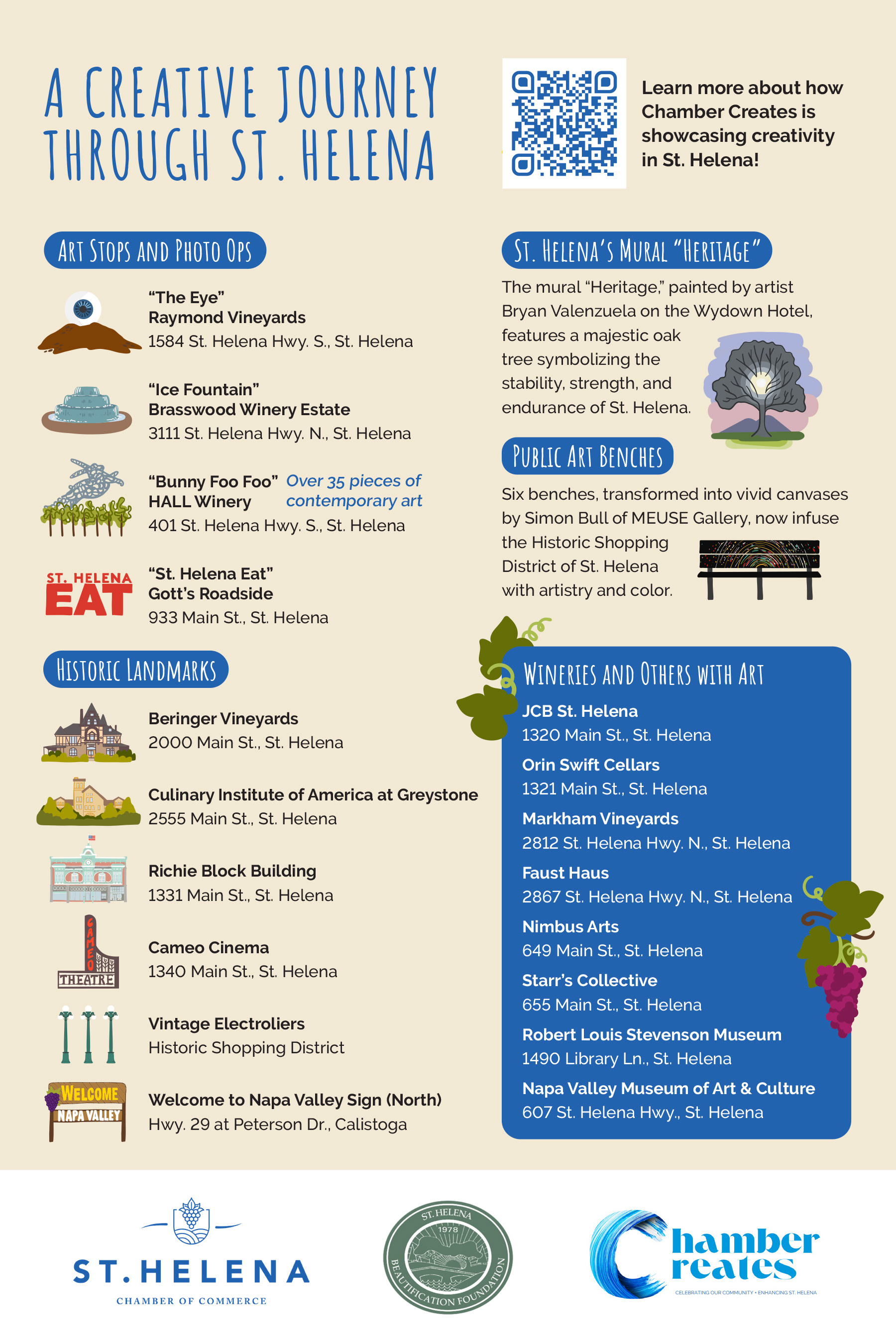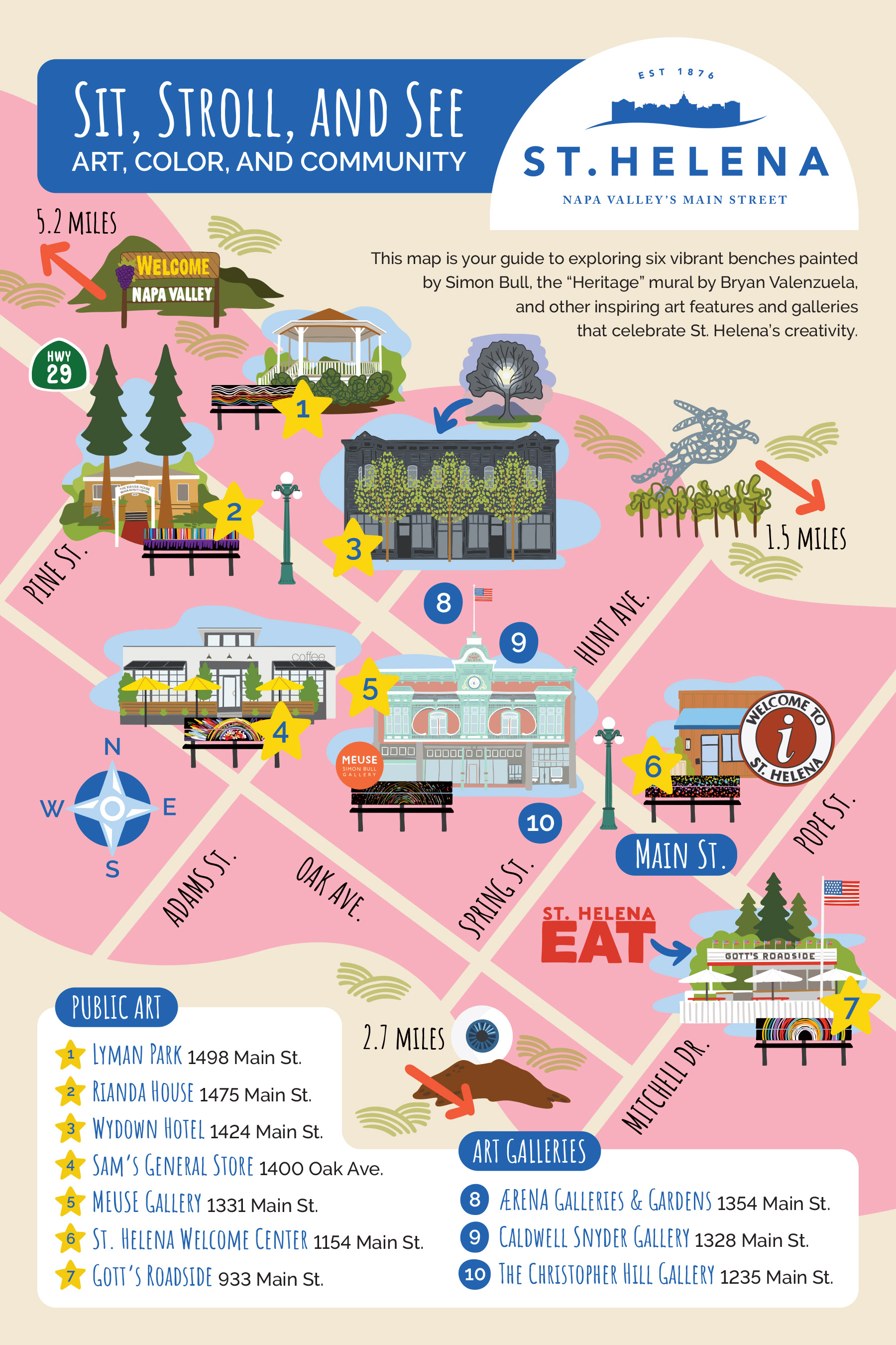 Illustration and design of an art-themed walking map for the St. Helena Chamber showcasing galleries and installations throughout the Historic Shopping District of St. Helena in Napa Valley. Each location is represented as a hand-crafted illustration, making this project a particularly satisfying creative experience.